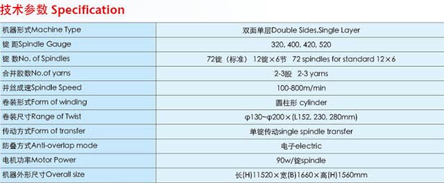 该机是我公司在吸收国内外有关先进技术的基础上自行设计的一种机型,该机可将两股至六股的纱线合并为一股,可卷绕成圆柱筒子,适用于棉、毛、涤化纤及混纺等纱线的合股加工。